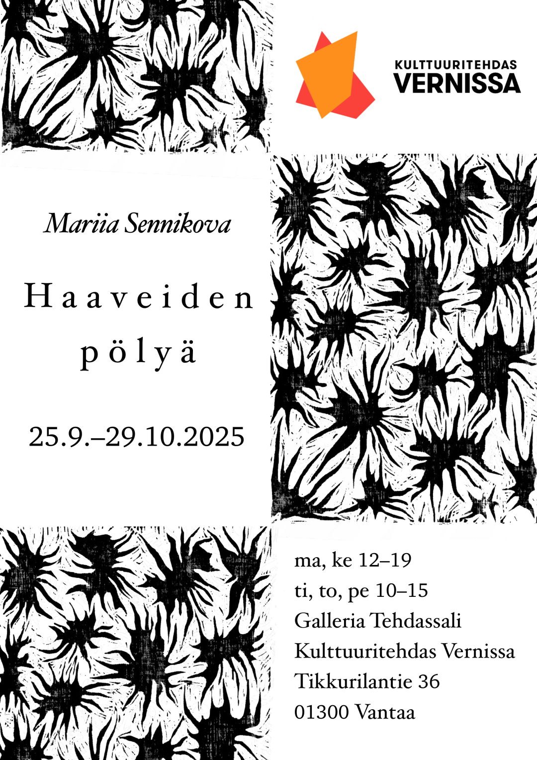The Vernissa Cultural Factory is a center for cultural youth work in Tikkurila, and the Tehdassali exhibition activities are aimed at young artists and enthusiasts (aged 10–29). Organizing an exhibition in the gallery is free of charge. Individual artists can apply with their own solo exhibition or a single work to be included in a group exhibition curated by Vernissa, as can existing groups and associations, organizations, and educational institutions aimed at young people. The exhibition period is initially one month. As a rule, the space is supervised on weekdays, but more detailed opening hours will be agreed with the artists on a case-by-case basis. Various materials and staff assistance are available for hanging the works.